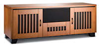 Two doors flank a center segment with a removable grille-covered speaker opening above a media drawer.